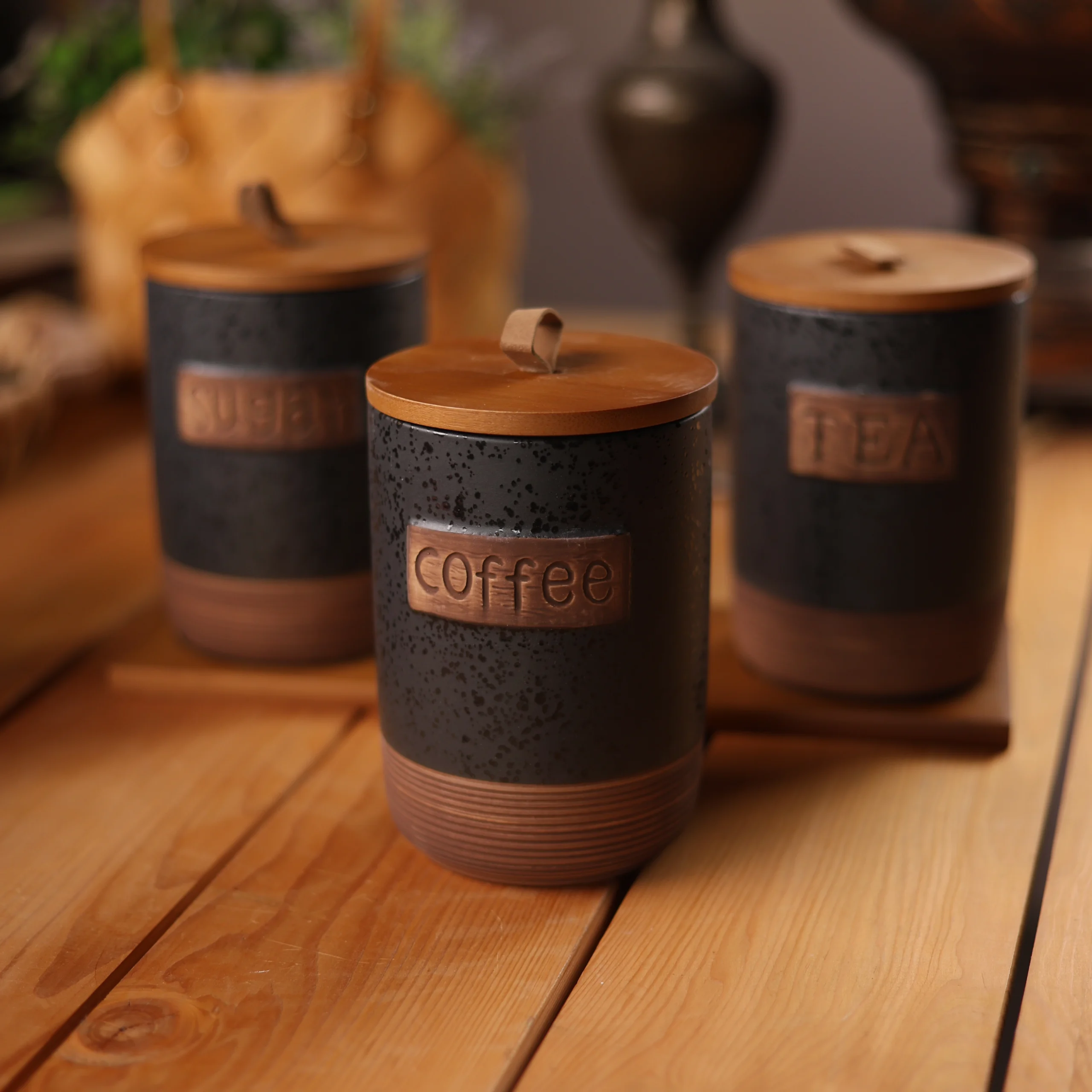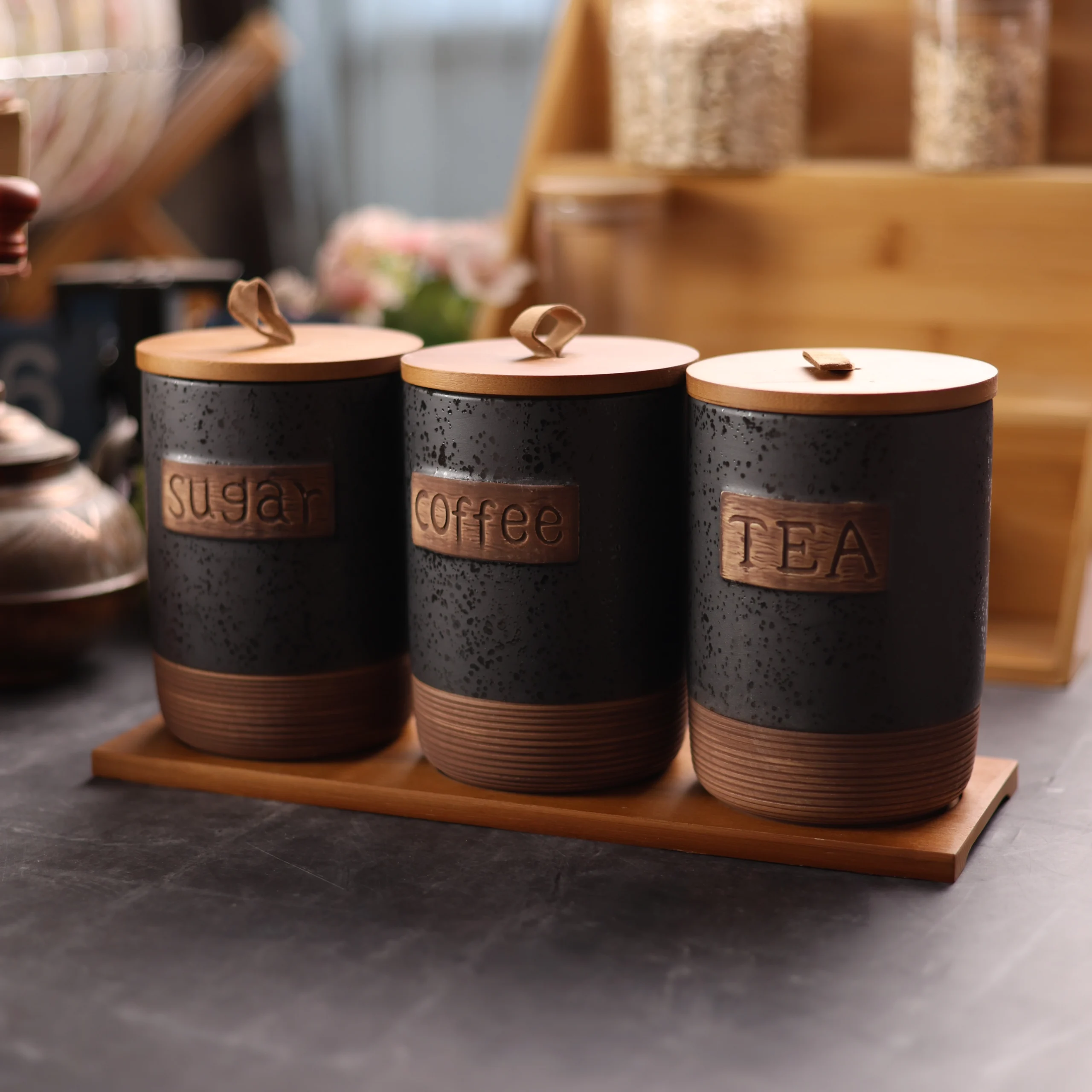 سيت شكردانات مصنوعة من الخزف مع اغطية و قاعدة مصنوعة من الخشب الطبيعي, سعة الشكردان : 700مل , يستعمل لحفظ الاغذية