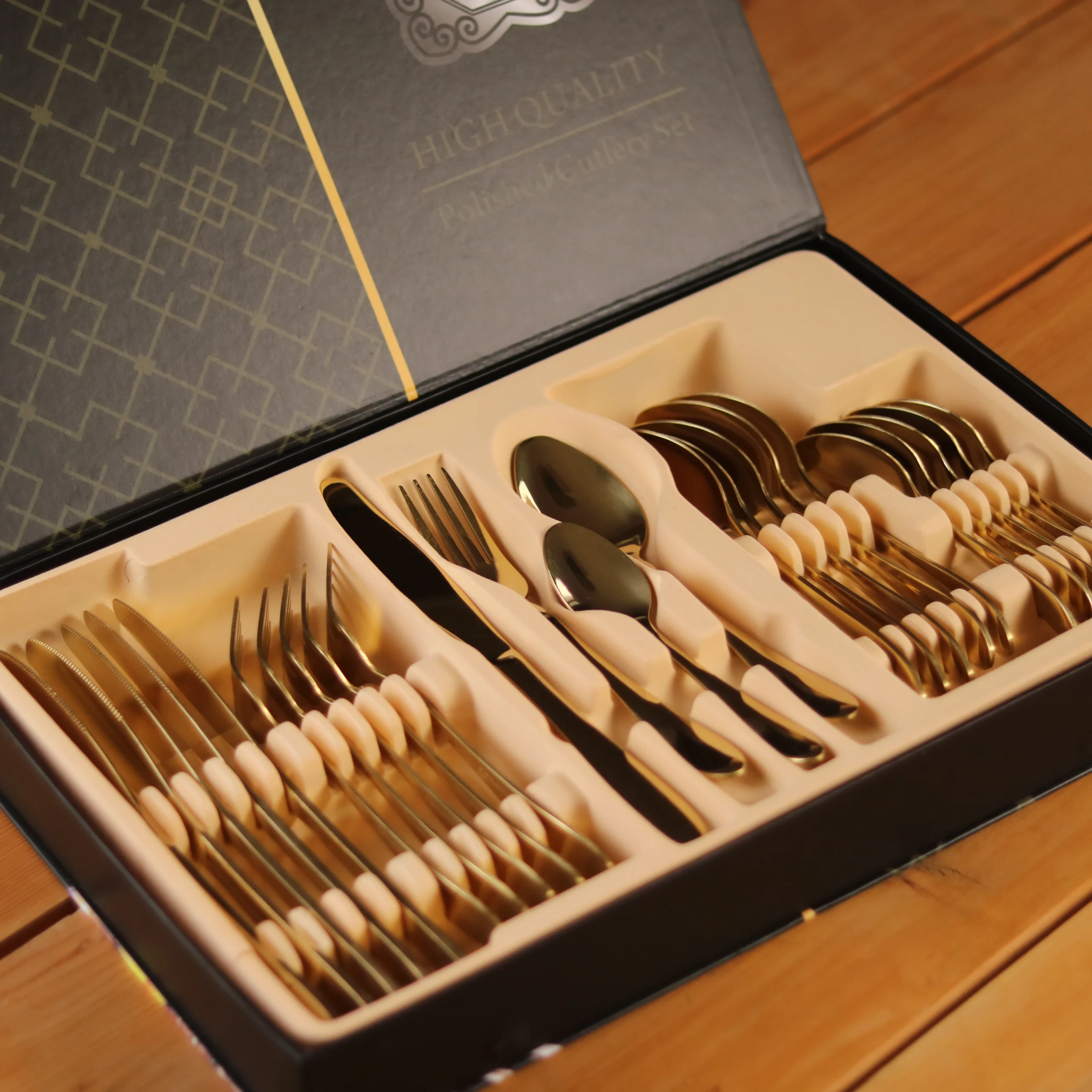 سيت يتكون من 24 قطعة : 6 ملاعق طعام , 6 ملاعق شاي , 6 شوكات طعام , 6 سكاكين , اللون : سلفر , و تاتي مع علبة