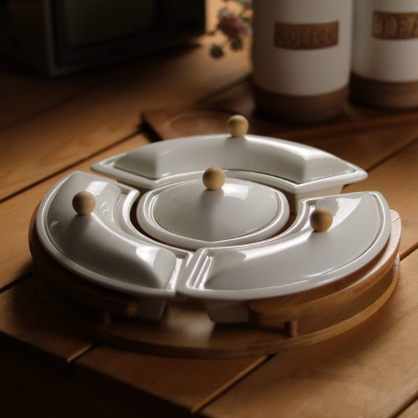 مقدمة تتكون من 4 اوعية مصنوعة من السيراميك مع قاعدة مصنوعة من الخشب, تستعمل لتقديم المكسرات او الحلويات