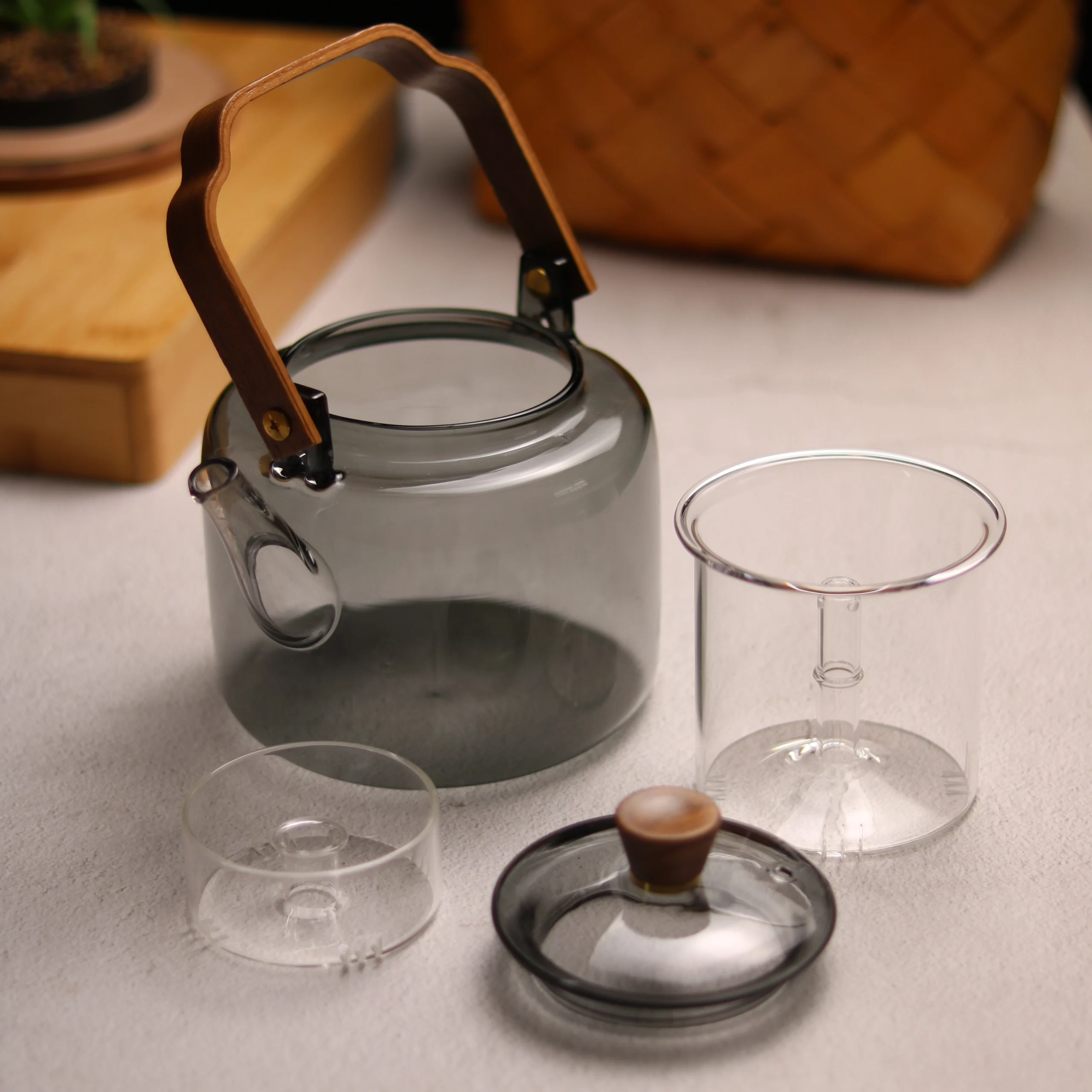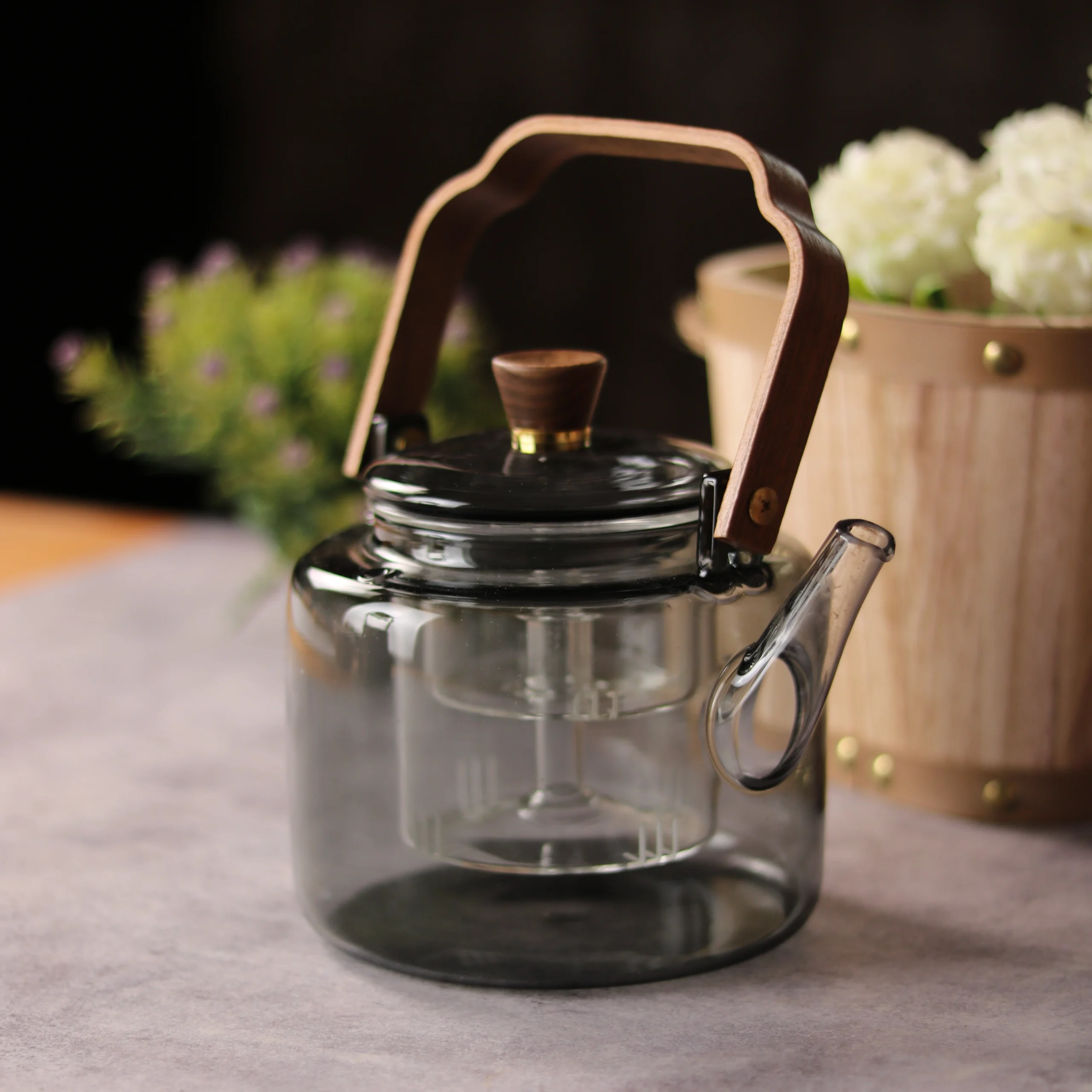 قوري مصنوع من الزجاج المقاوم للحرارة( بايركس ) مع مصفيين و مقبض مصنوع من الخشب
