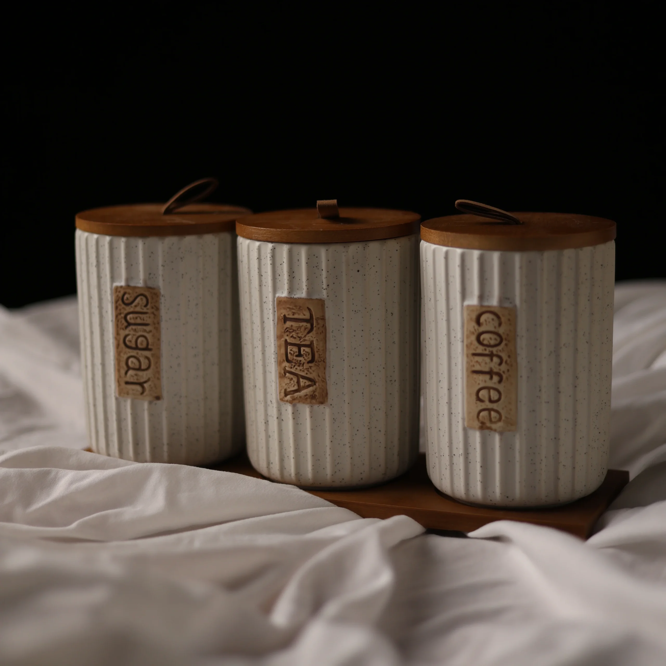 سيت حافظات مصنوعة من السيراميك, يتكون من ثلاث حافظات بسعة : 700مل و قاعدة مصنوعة من الخشب الطبيعي