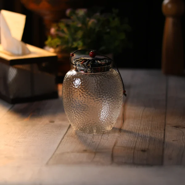 شكردان زجاجي شفاف بتصميم أنيق وفريد، مزوّد بغطاء قماشي يضيف لمسة جمالية تقليدية. مناسب لتخزين الشاي، الأعشاب أو البقوليات مع الحفاظ على النكهة والطزاجة