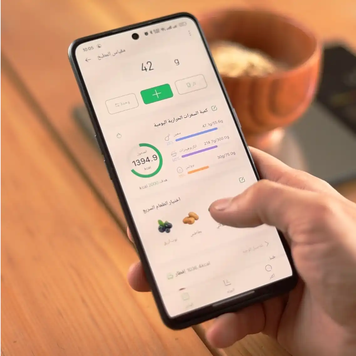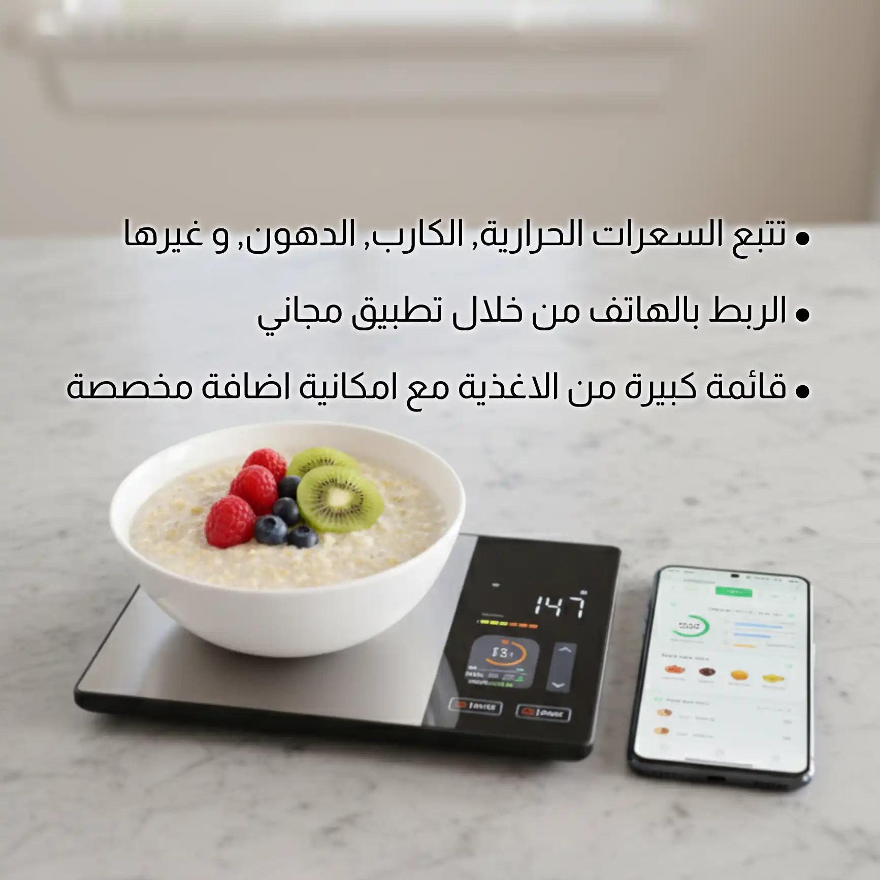 📱 مدربك الخاص بمطبخك: اربط الميزان بتطبيق الموبايل، وراقب سعراتك والماكروز (بروتين، كارب، دهون) لكل وجبة تاكلها بكل سهولة. ماكو بعد حرمان أو أكل عشوائي!